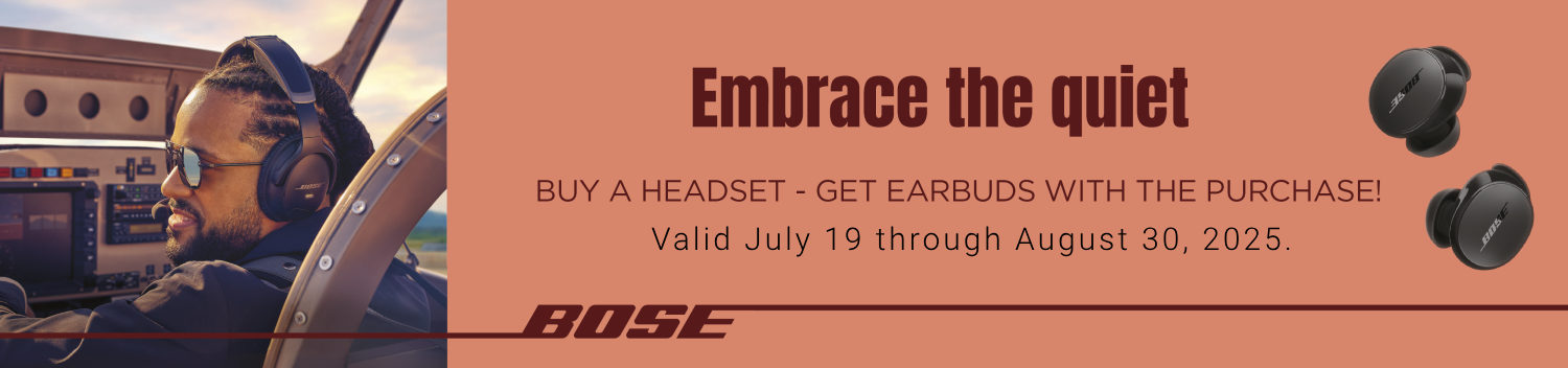Get a set of black Bose QuietComfort Earbuds when you purchase an A30 or ProFlight Series 2 flight headset between July 19th and August 30th 2025. Bose designed these two headsets to meet the needs of pilots in all aviation environments. Whether you choose the around-ear or in-ear design, you get three modes of active noise cancellation with unparalleled versatility, clarity and comfort. If you buy two or more headseats during the campaign period, you will get 10 % discount on the second, third and so on headset.