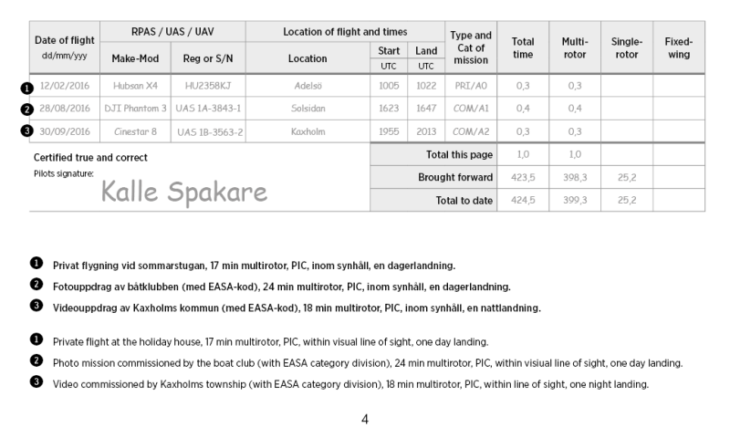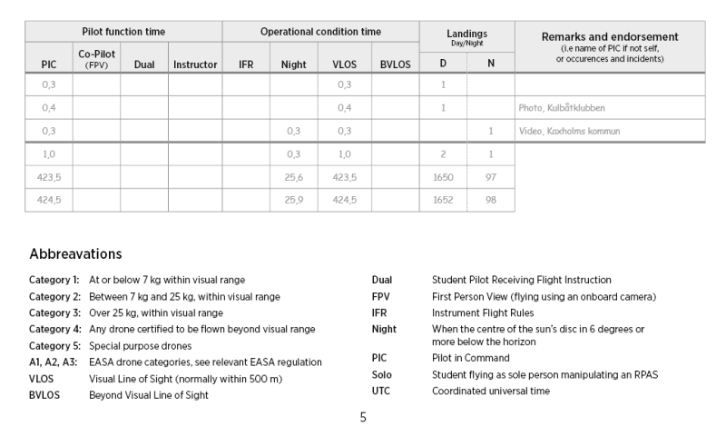 The logbook is for everyone who operates unmanned aircrafts system, drones also called: RPAS / UAS / UAV. Equipped with plastic pocket for future license / certificate and medical. 38 spread 12 times = 456 flights. According to ICAO, EU and for commercial organizations according to the Swedish Transport Agency's requirements. This personal logbook meets the minimum requirements imposed on organizations that hold a license to operate commercial flights and contains spreads and columns for future requirements.