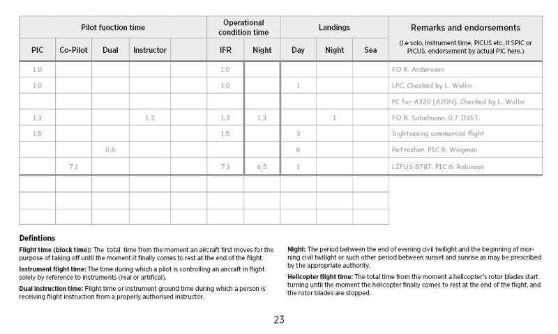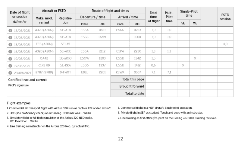 Loggboken är till för yrkespiloter inom kommersiella flyget och uppfyller kraven enligt EASA AMC1-FCL.050. Loggboken har 52 uppslag med 12 rader = 624 flygningar kan noteras. Det finns 2 tomma kolumner för egna anteckningar och plastficka för certifikat och medical.