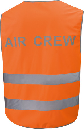 Orange väst enligt WN471 med två reflexband, två reflexloggo och knäppning med kardborrband.
