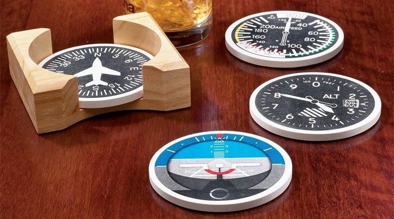 Underläggen är tillverkade av en unik naturlig sammansättning och absorberar kondens från din kopp. Dina möbler är skyddade från repor eftersom baksidan är av mjuk kork. Varje uppsättning underlägg levereras komplett med höjdmätare, flyghastighetsindikator, artificiell horisont och riktningsgyro i en solid trähållare. Underläggen är 10 cm i diameter.
